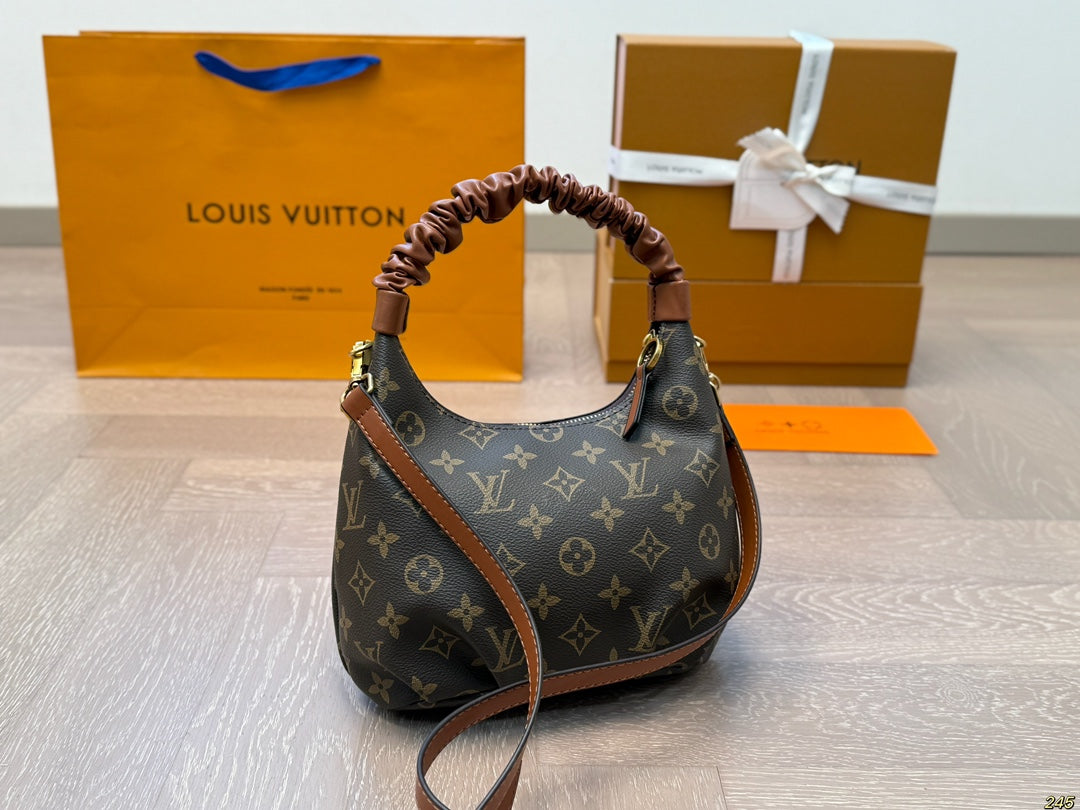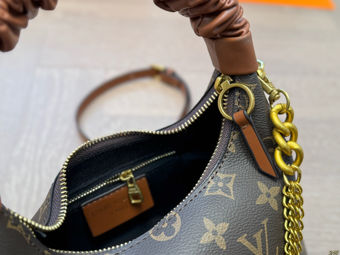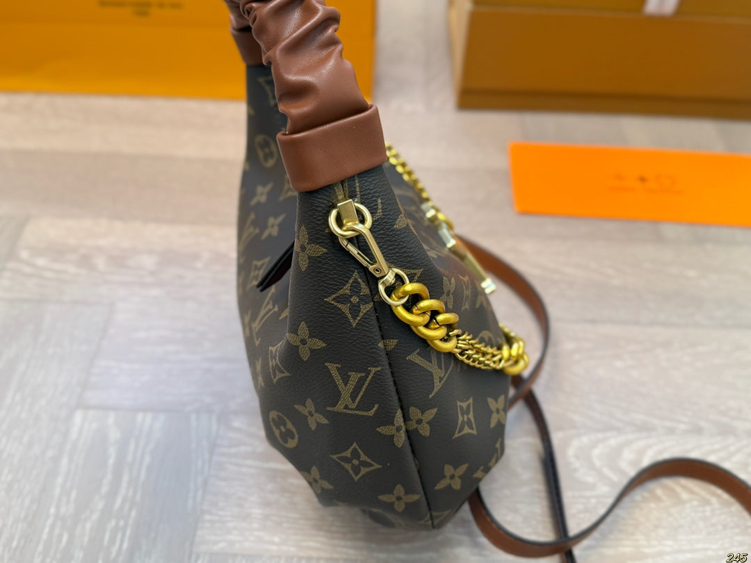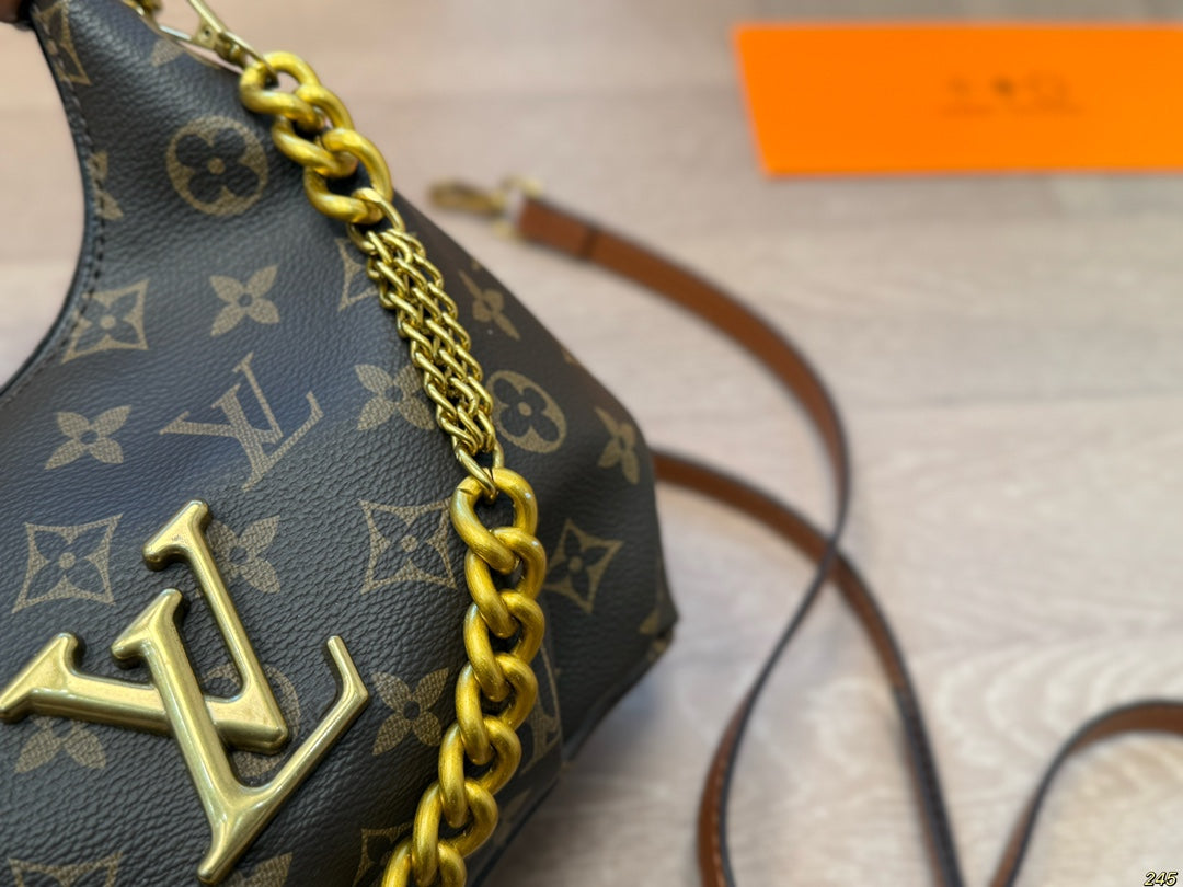 Diese luxuriöse Luis Handtasche vereint klassisches Design mit modernen Akzenten. Gefertigt aus dem ikonischen Rindspaltleder, ist sie ein eleganter Hingucker für jeden Anlass. Die halbrunde Hobo-Form wird durch ein großes, goldfarbenes „LV“-Logo auf der Vorderseite stilvoll ergänzt.
