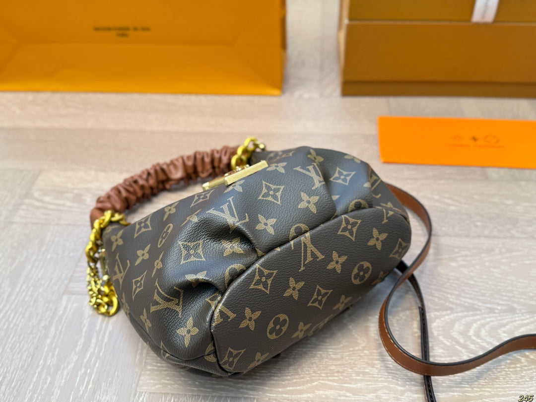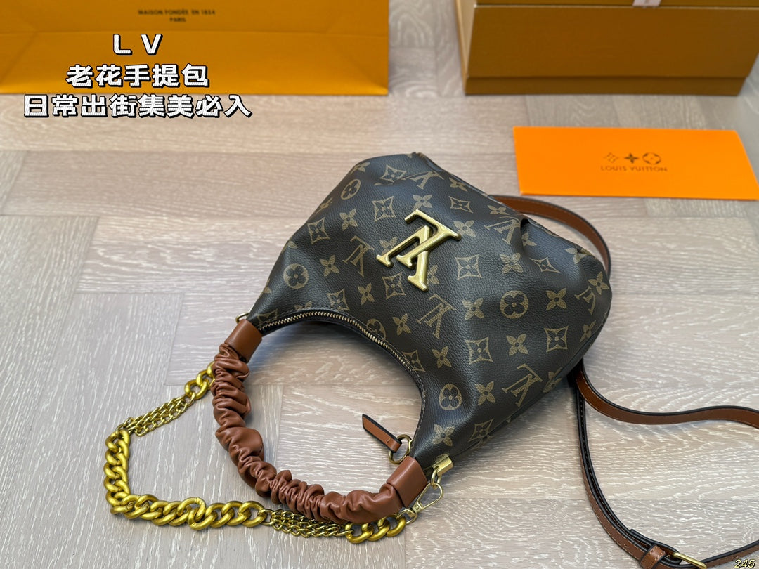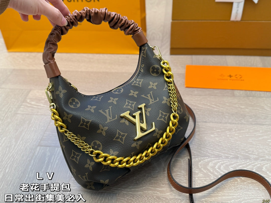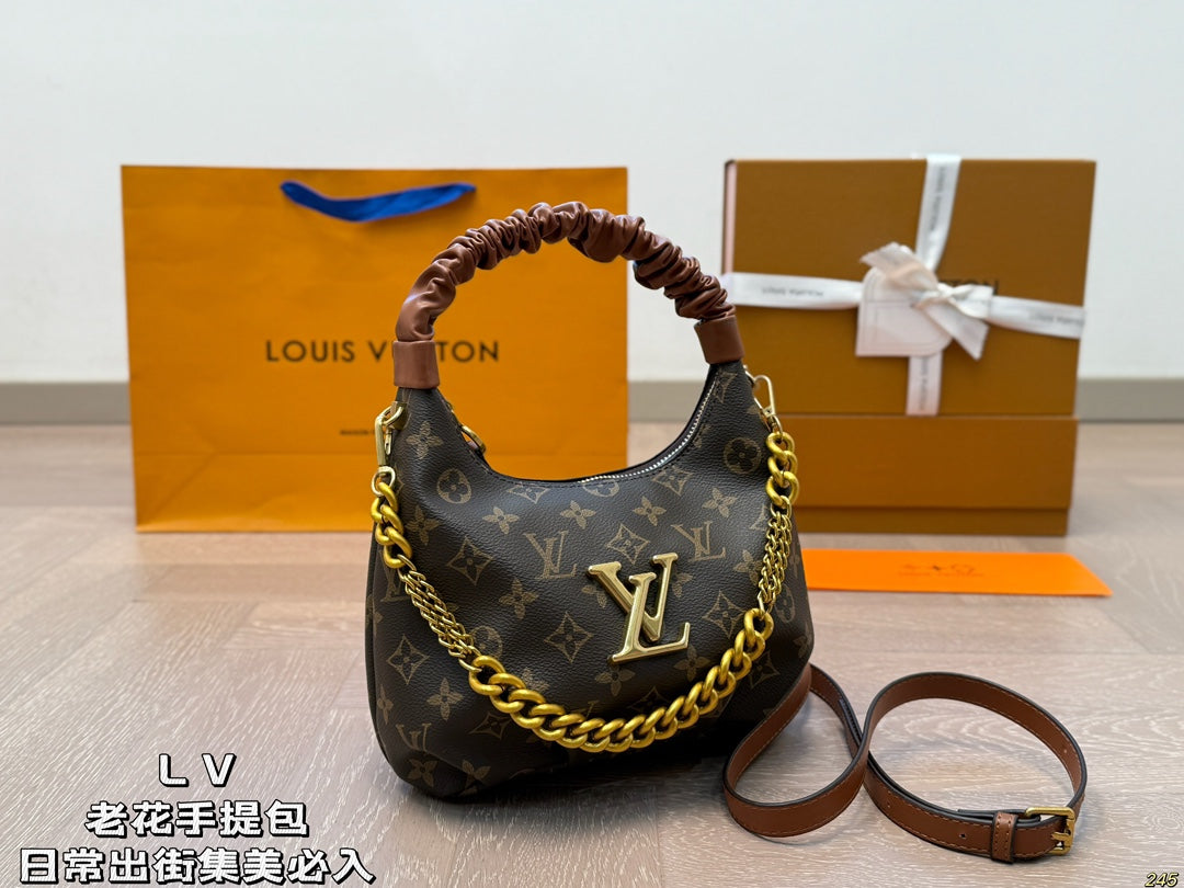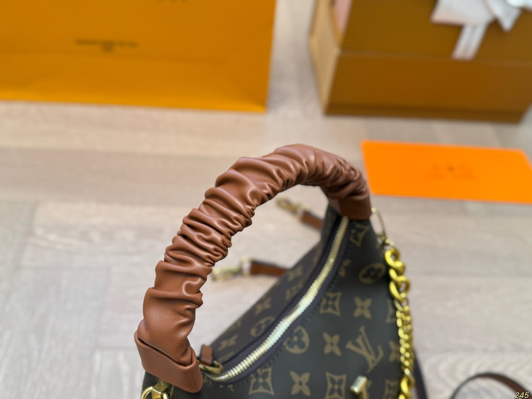 Diese luxuriöse Luis Handtasche vereint klassisches Design mit modernen Akzenten. Gefertigt aus dem ikonischen Rindspaltleder, ist sie ein eleganter Hingucker für jeden Anlass. Die halbrunde Hobo-Form wird durch ein großes, goldfarbenes „LV“-Logo auf der Vorderseite stilvoll ergänzt.