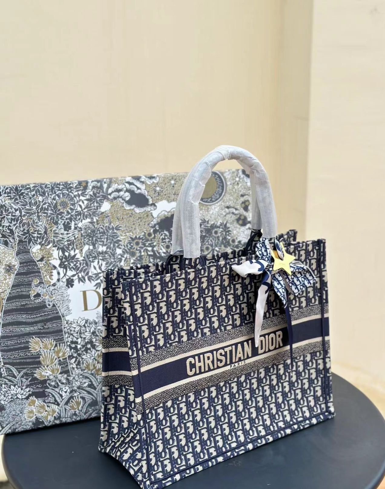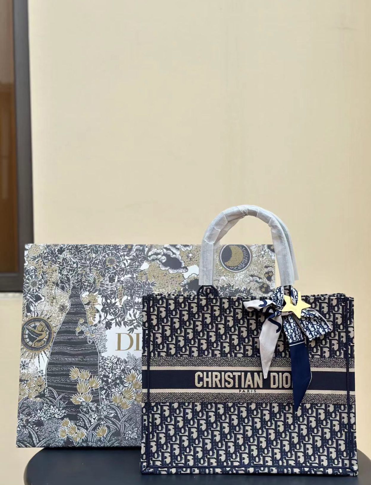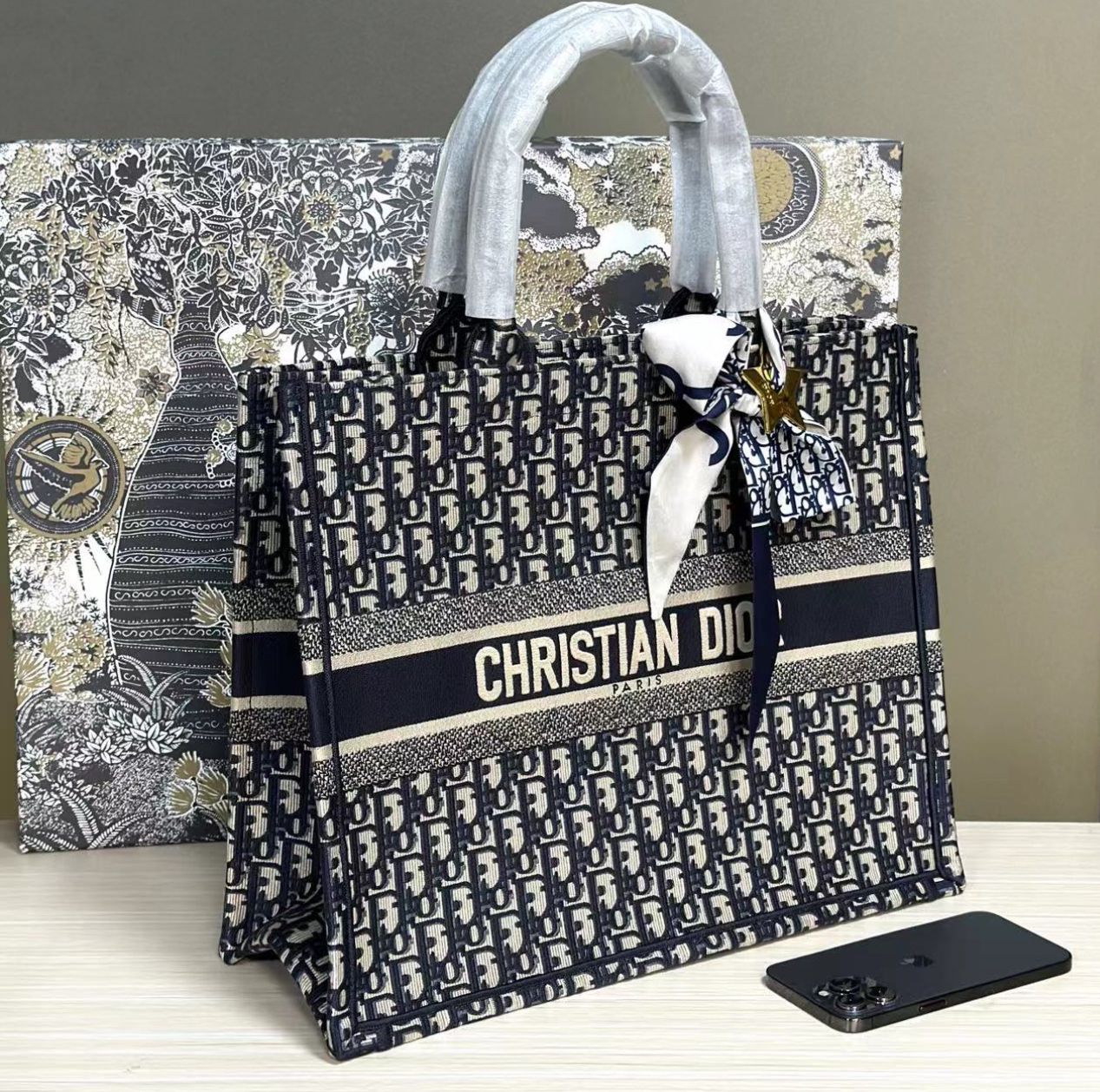 Die CD Book Tote, entworfen von Kreativdirektorin Maria Grazia Chiuri, ist zu einem ikonischen Symbol der CD Ästhetik avanciert. Mit dem markanten, durchgehend gestickten CD Oblique Motiv in Ecru und Blau bietet diese große Tote Tasche ausreichend Platz für alle alltäglichen Essentials. Der auffällige CD Paris Schriftzug auf der Vorderseite unterstreicht das unverwechselbare Design, das meisterhaftes Handwerk widerspiegelt. Diese Tasche lässt sich sowohl in der Hand tragen als auch bequem über der Schulter tragen, was ihre Vielseitigkeit und Eleganz betont.
